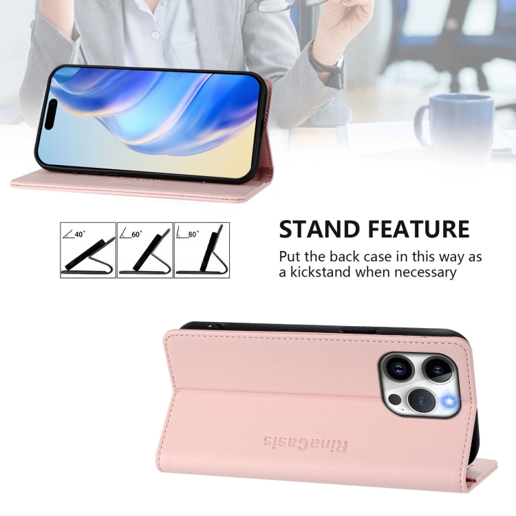 Funda de Cuero para iPhone 14 Pro Max Rc01 Doble Pliegue Succión Magnética (Rosa)