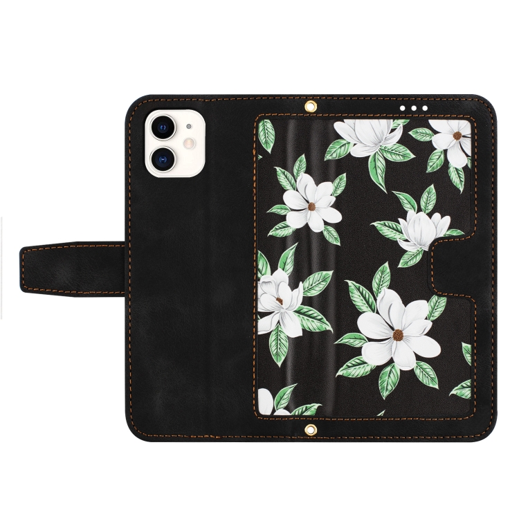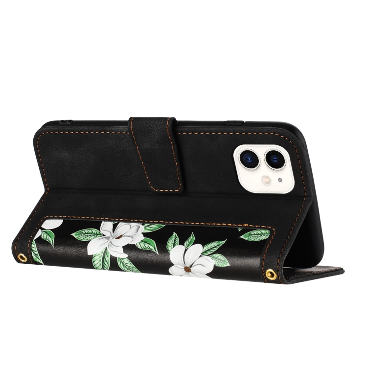 Funda de Cuero con Estampado Floral para iPhone 12 Mini con Cordón (Negro)
