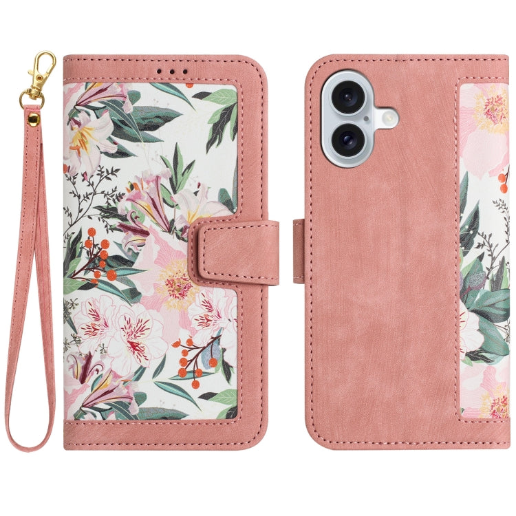 Funda de Cuero iPhone 16 Estampado Floral con Cordón (Rosa)