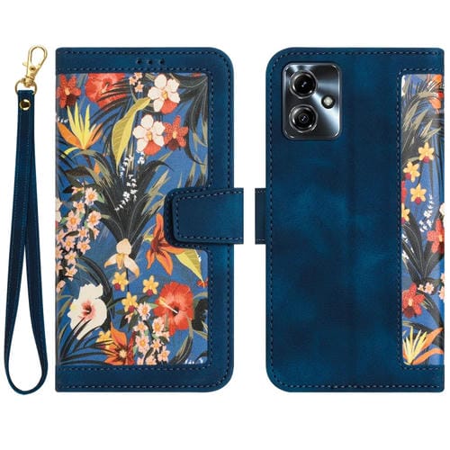 Funda de Cuero con Estampado Floral para Motorola Moto G14 con Cordón (Azul Oscuro)