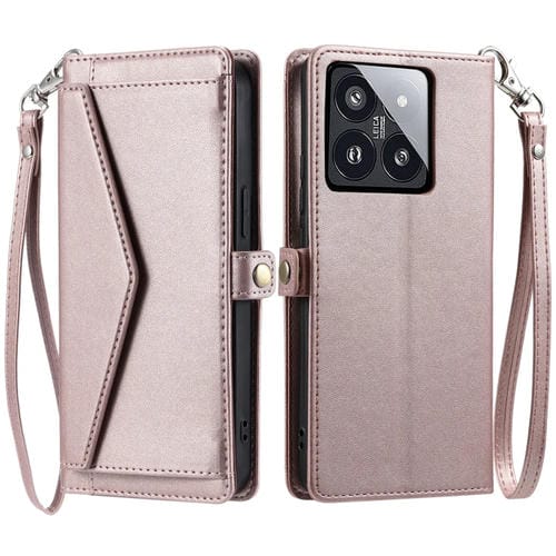 Funda De Cuero Con Ranura Para Múltiples Tarjetas Y Cordón Para Xiaomi 14 Pro (Oro Rosa)