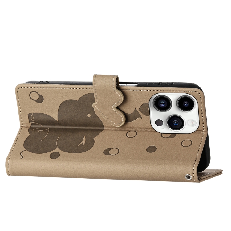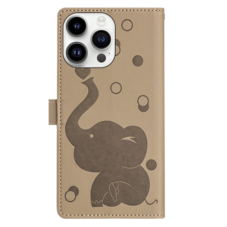 Funda de Cuero para iPhone 16 Pro con Relieve de Elefante de Dibujos Animados (Caqui)