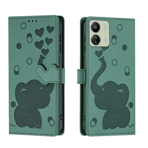 Funda de Cuero con Relieve de Elefante de Dibujos Animados para Redmi 13C 4G (Verde)