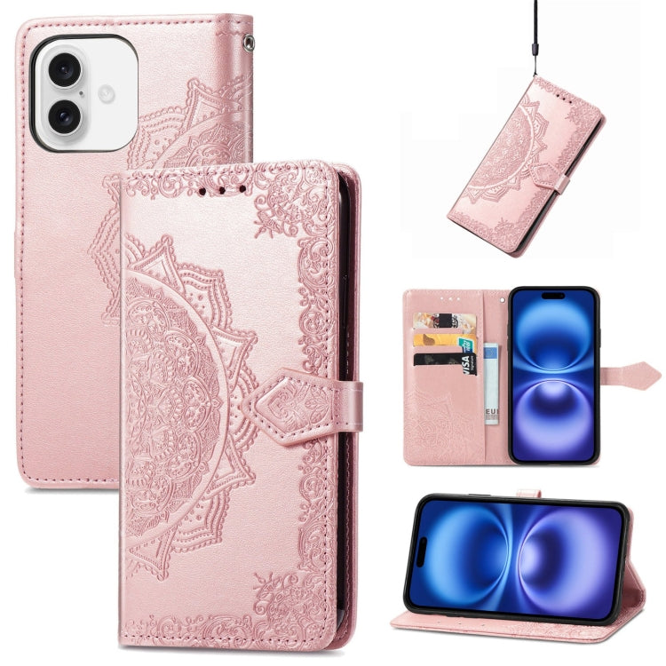 Funda de Cuero para iPhone 16 con Relieve de Flor de Mandala (Oro Rosa)