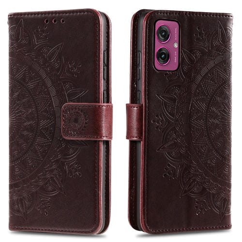 Funda de Cuero con Relieve de Flores y Tótem para Motorola Moto G55 con Cordón (Marrón)