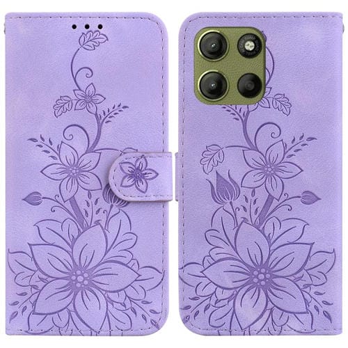 Funda de Cuero con Relieve de Lirios para Motorola Moto G15 (Morado)