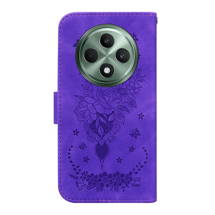 Funda de Cuero con Relieve de Mariposa y Rosa para Oppo Reno12 F 5G (Morado)