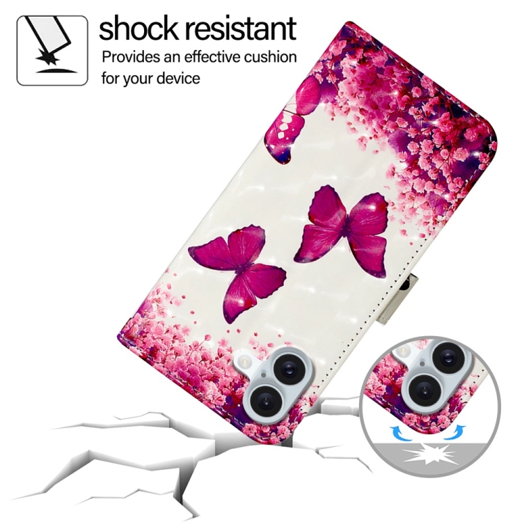 Funda de Cuero con Tapa Horizontal con Pintura 3D para iPhone 16 Plus (Mariposa Rosa)