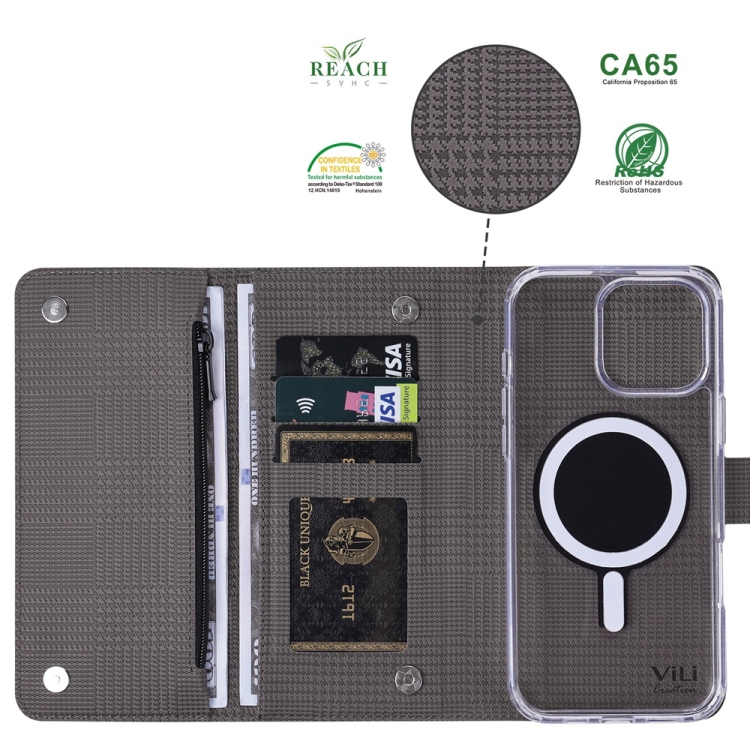 Funda de Cuero con Tapa Magnética Rfid Magsafe Vili Serie Ghb-C para iPhone 16 Plus (Gris)