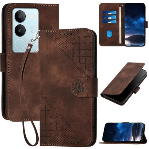 Funda de Cuero con Tapa y Cordón para Vivo V29 Pro Yx0080 con Diseño En Relieve de Mariposa y Cuadrícula (Café)