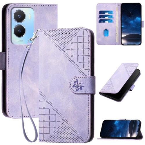 Funda de Cuero con Tapa y Cordón para Vivo Y16 4G Global Yx0080 con Diseño En Relieve de Mariposa y Cuadrícula (Morado Claro)