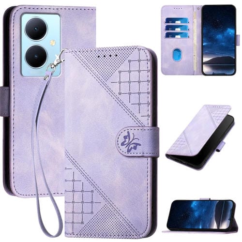 Funda de Cuero con Tapa y Cordón para Vivo Y78+ 5G Global / V29 Lite Yx0080 con Diseño En Relieve de Mariposa y Cuadrícula (Morado Claro)