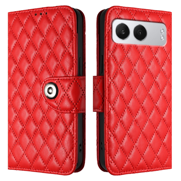 Funda de Cuero con Tapa y Textura Rombal para OnePlus Nord 4 5G con Cordón (Rojo)