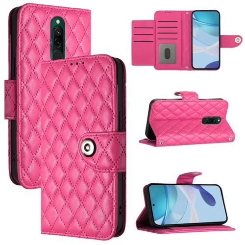 Funda de Cuero con Tapa y Textura Rombal para Redmi 8 con Cordón (Rosa y Rojo)