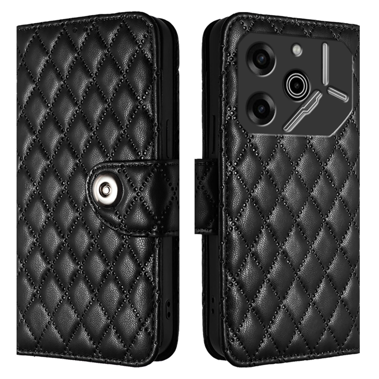 Funda de Cuero con Tapa y Textura Rombal para Tecno Pova 6 Pro y Pova 6 5G con Cordón (Negro)