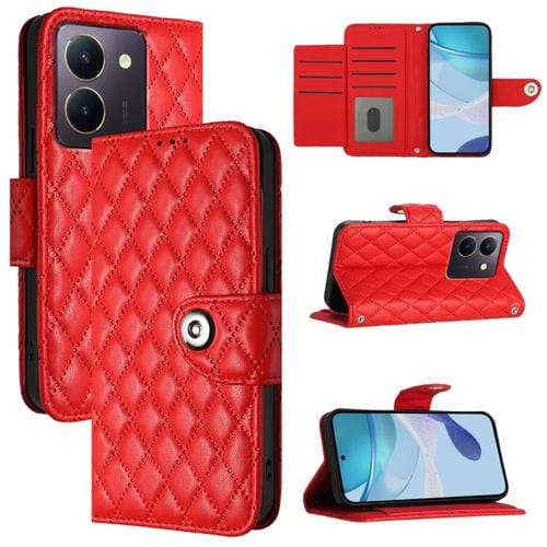 Funda de Cuero con Tapa y Textura Rómbica para Vivo Y27 5G/Y27S con Cordón (Rojo)