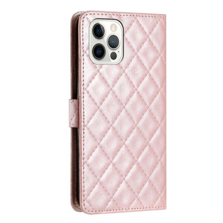 Funda de Cuero iPhone 16 Pro Max Textura Celosía y Rombos (Oro Rosa)