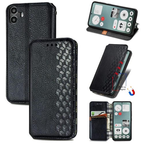 Funda de Cuero Magnética para Teléfono cmf Phone 1 con Cuadrícula Cúbica Prensada (Negra)