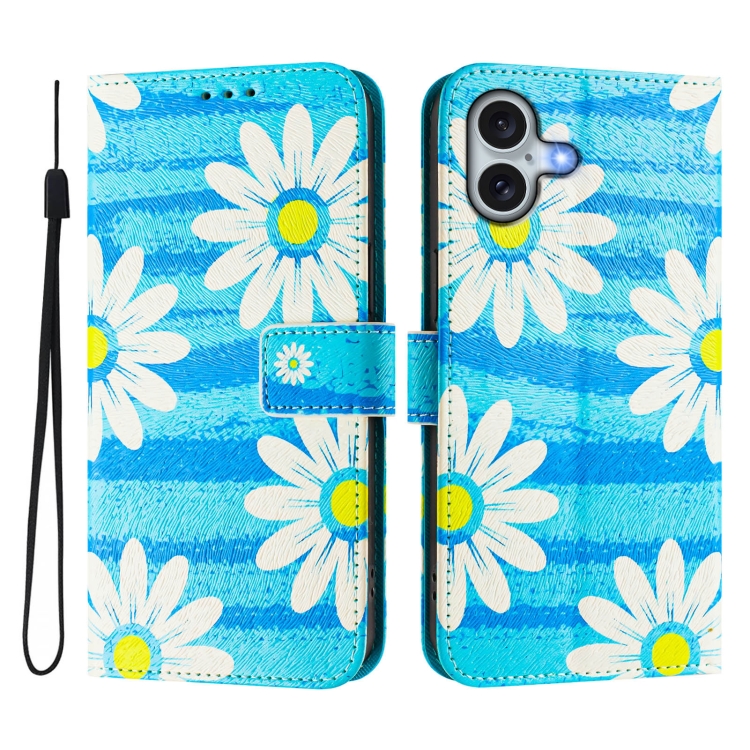 Funda de Cuero para iPhone 16 con Patrón de Dibujo Artístico (Margarita Azul)