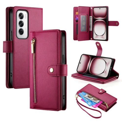 Funda de Cuero para Teléfono con Nueve Ranuras para Tarjetas y Cremallera para Oppo Reno12 Global (Rojo)