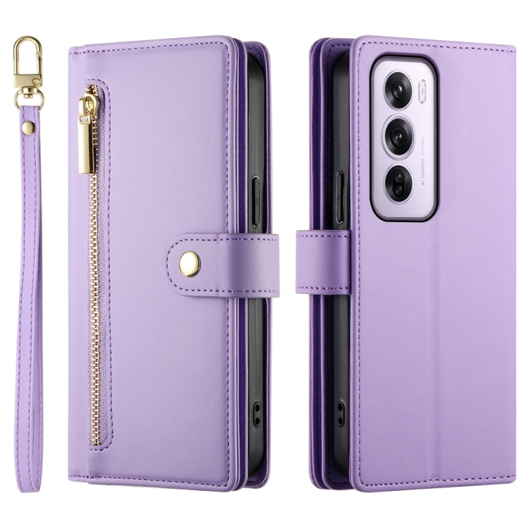 Funda de Cuero para Teléfono con Nueve Ranuras para Tarjetas y Cremallera para Oppo Reno12 Pro Global (Morado)