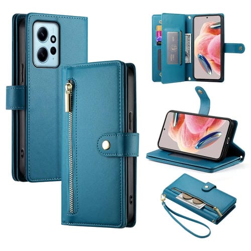 Funda de Cuero para Teléfono con Nueve Ranuras para Tarjetas y Cremallera para Redmi Note 12 4G/Note 12R Pro (Azul)