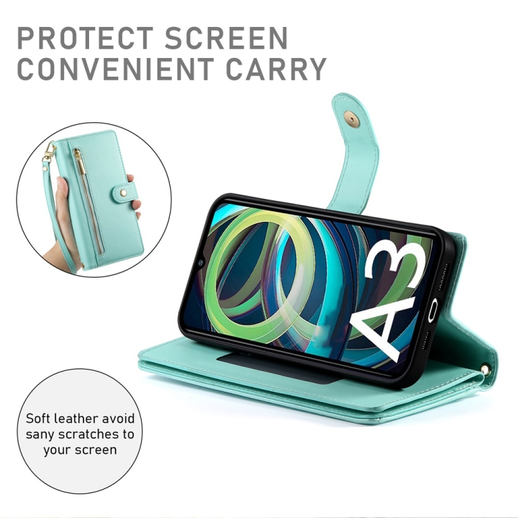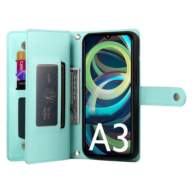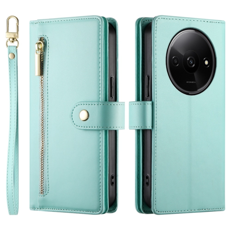 Funda de Cuero para Teléfono Redmi A3 con Nueve Ranuras para Tarjetas y Cremallera (Verde Menta)