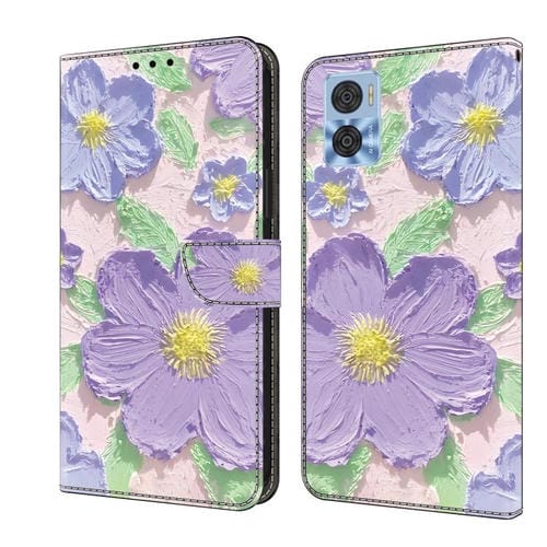 Funda de Cuero Pintada al Óleo para Motorola Moto E22 (Flores Moradas)