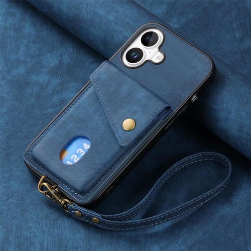 Funda de cuero plegable estilo billetera retro para iPhone 17 con correa (azul)