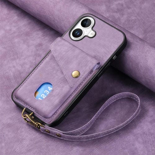 Funda de cuero plegable estilo billetera retro para iPhone 17 con correa (morado)