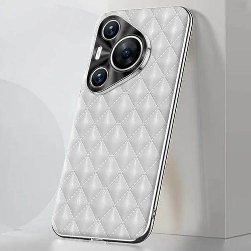 Funda Cuero Pu Textura Rómbica Borde Plateado para Huawei Pura 70 Pro/70 Pro+ (Blanca)