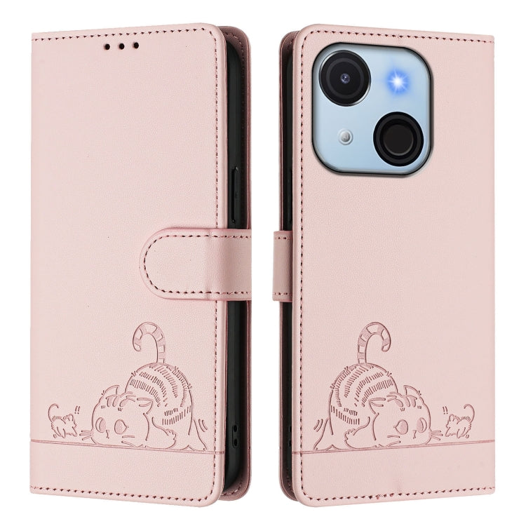 Funda de Cuero Rfid para Teléfono Itel A50C con Estampado de Rata y Gato y Cordón (Rosa)