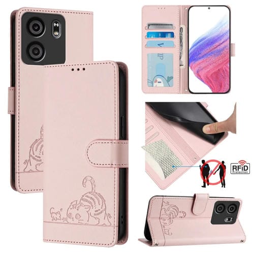 Funda de Cuero RFID para Blu View 5 con Relieve de Rata y Gato y Cordón (Rosa)