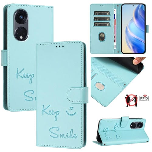 Funda de Cuero Rfid con Relieve de Sonrisa Global para Oppo A1 Pro 5G/Reno8 T 5G (Verde Menta)
