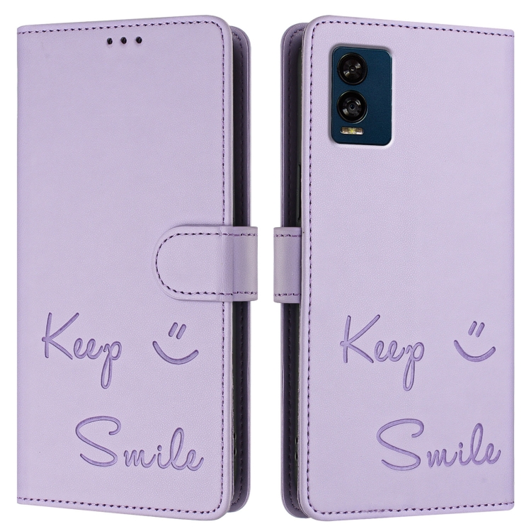 Funda de Cuero RFID con Relieve Sonriente para Blu View Speed 5G (Morado Claro)