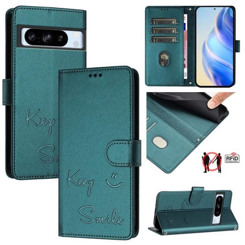 Funda de Cuero Rfid con Relieve Sonriente para Google Pixel 8 Pro (Verde Pavo Real)