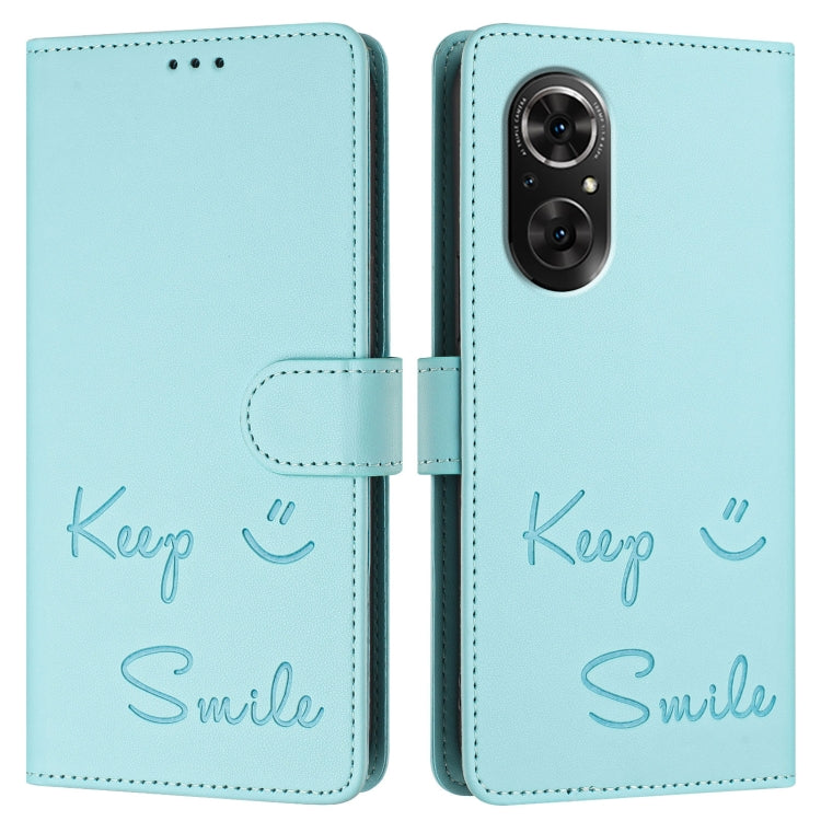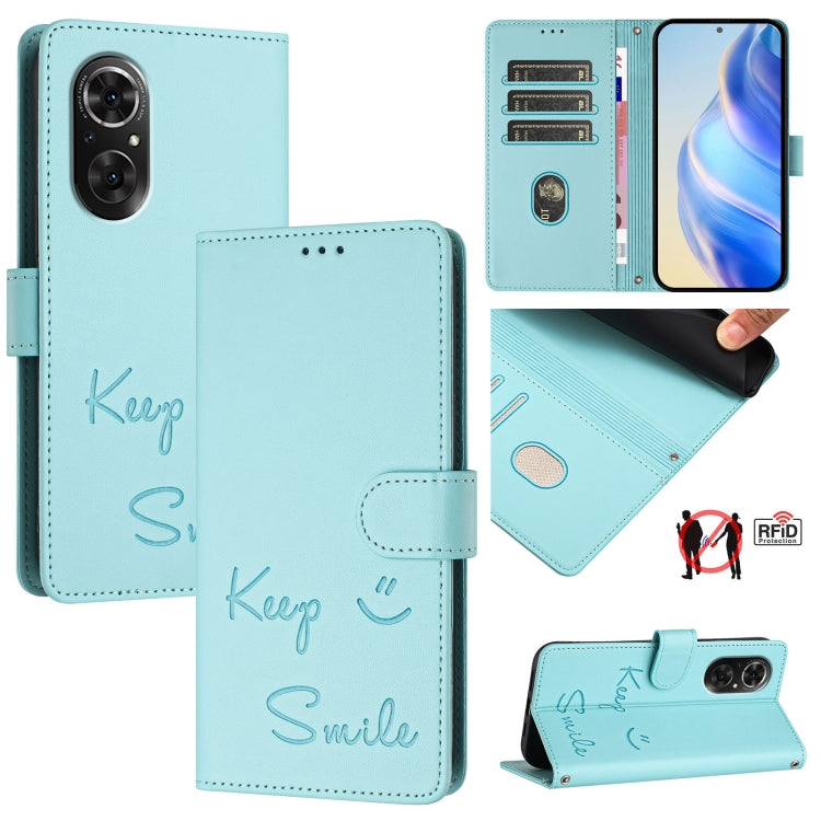 Funda de Cuero Rfid con Relieve Sonriente para Huawei Nova 9 Se (Verde Menta)