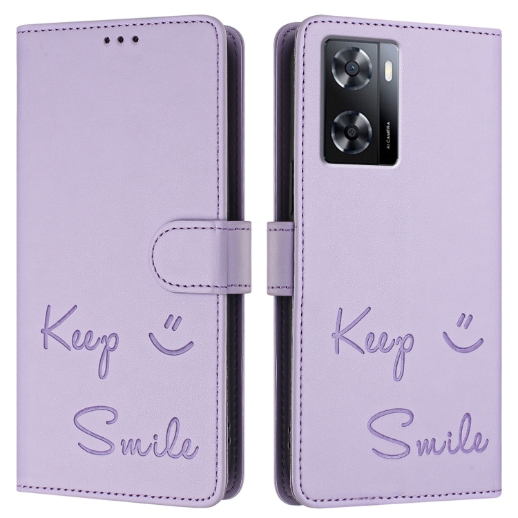 Funda de Cuero Rfid con Relieve Sonriente para Oppo A77 4G/A77S 4G (Morado Claro)