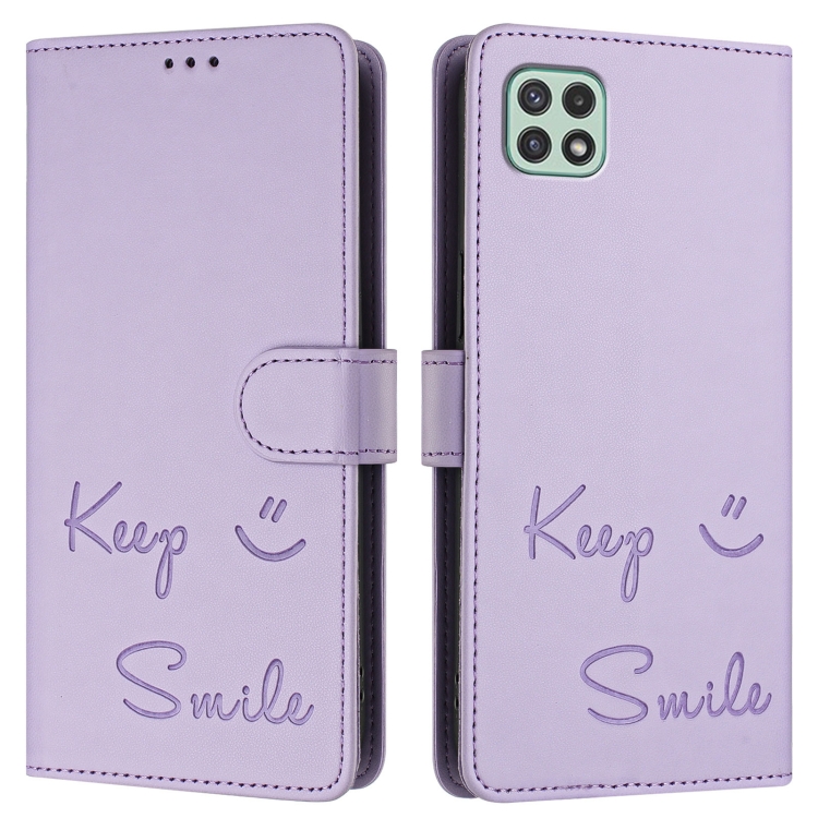 Funda Cuero RFID Samsung Galaxy A22 5G A22S F42 5G Relieve Sonriente (Morado Claro)