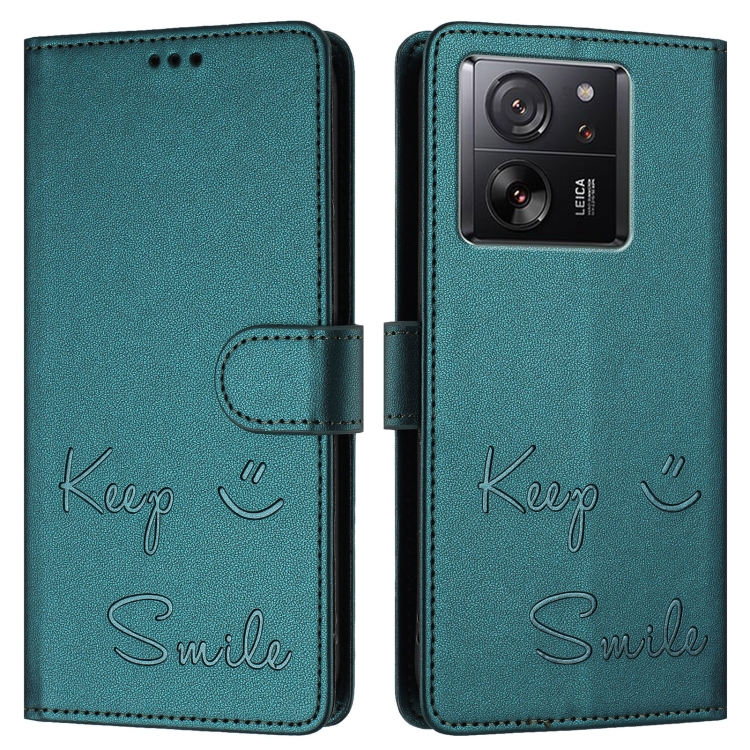 Funda de Cuero Rfid con Relieve Sonriente para Xiaomi 13T/13T Pro (Verde Pavo Real)