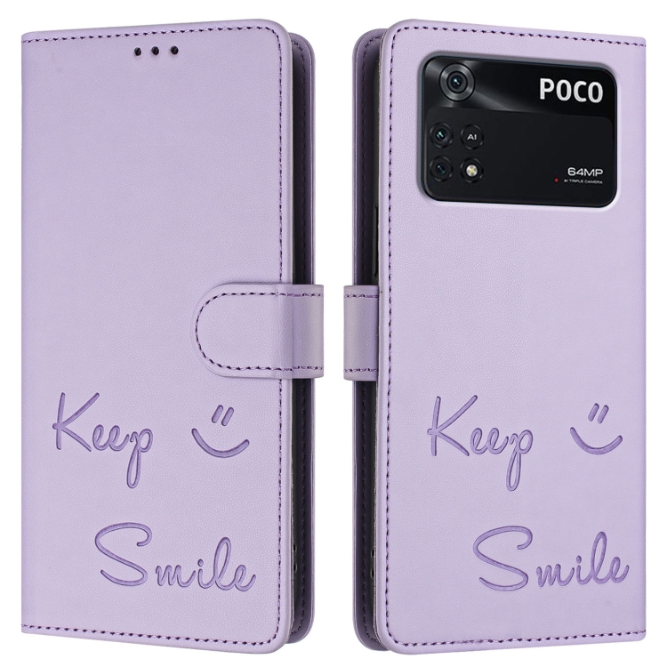 Funda de Cuero Rfid con Relieve Sonriente para Xiaomi Poco M4 Pro 4G (Morado Claro)