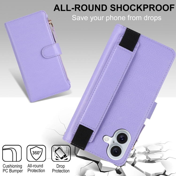 Funda de Cuero Rfid para iPhone 16 con Cierre de Cremallera y Soporte para Pulsera (Morado)