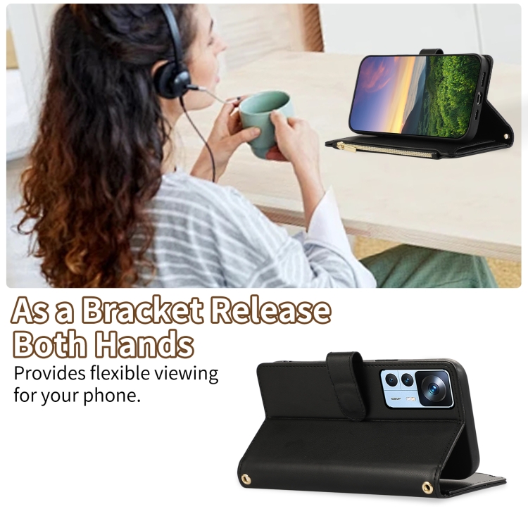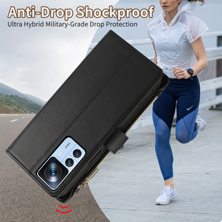 Funda de Cuero Tipo Billetera con Cremallera Rombal para Xiaomi 12T/12T Pro (Negra)