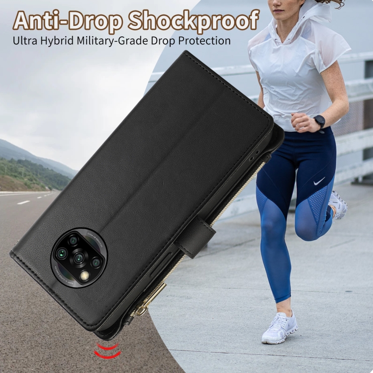 Funda de Cuero Tipo Billetera con Cremallera Rombal para Xiaomi Poco X3 Nfc (Negra)
