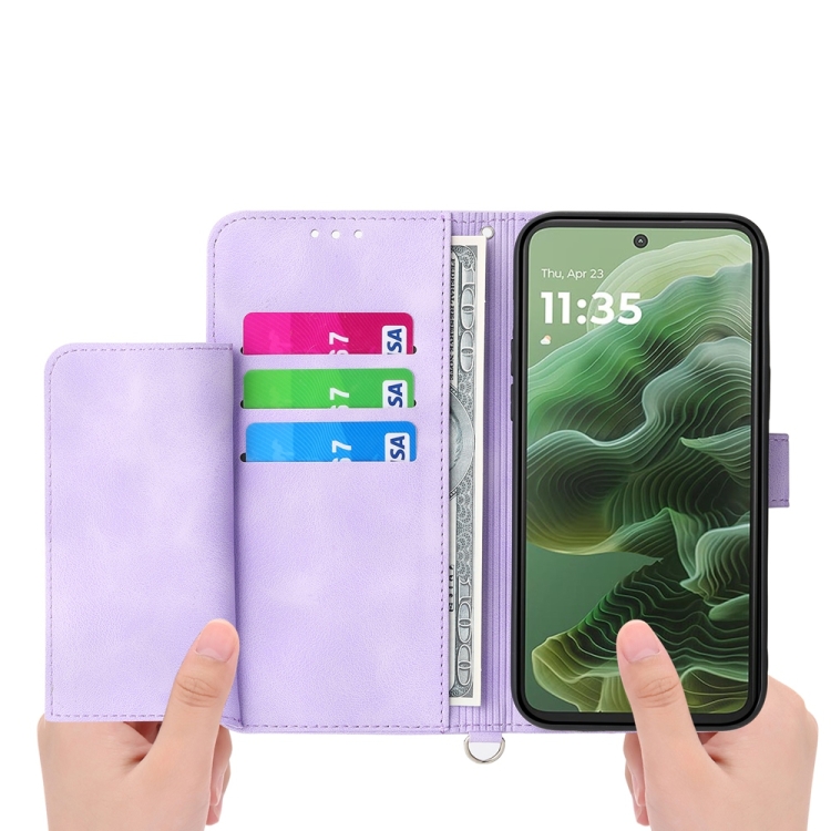 Funda Cuero Tipo Billetera Motorola Moto G55 Diseño Flores En Relieve (Morado)