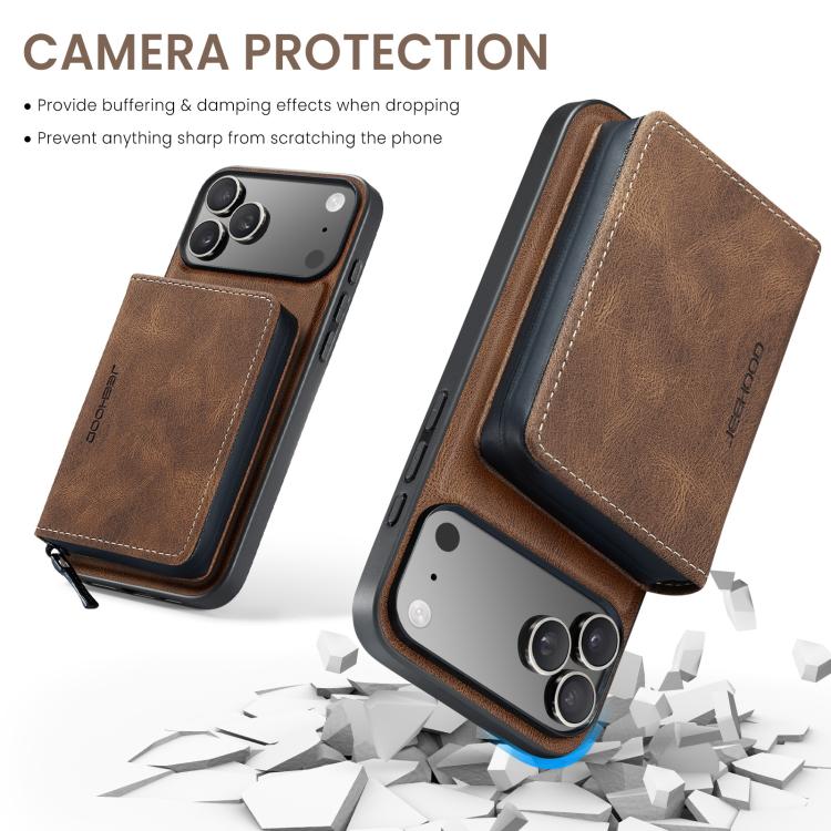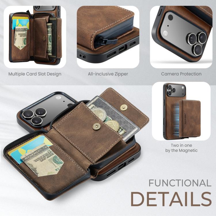 Funda de piel con cremallera magnética horizontal tipo libro JEEHOOD J02 para iPhone 17 Pro (marrón)