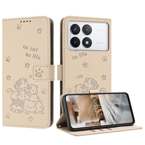 Funda de Piel con Diseño de Gatito En Relieve y Cordón para Xiaomi Poco F6 Pro 5G (Beige)