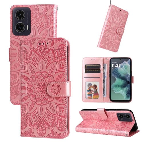 Funda de Piel Motorola Moto G35 con Diseño de Girasol en Relieve (Oro Rosa)