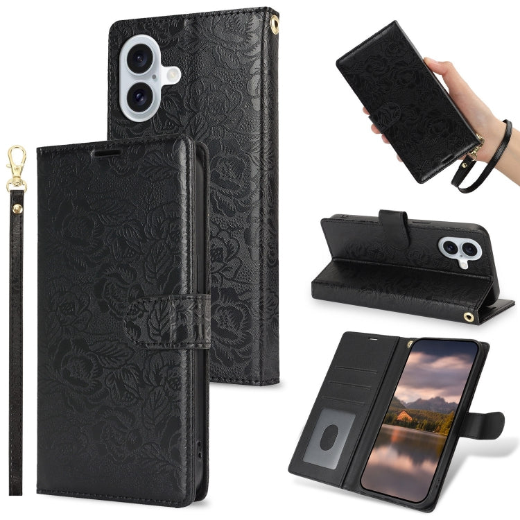 Funda de Piel Estampado Flores de Peonía para iPhone 16 (Negra)