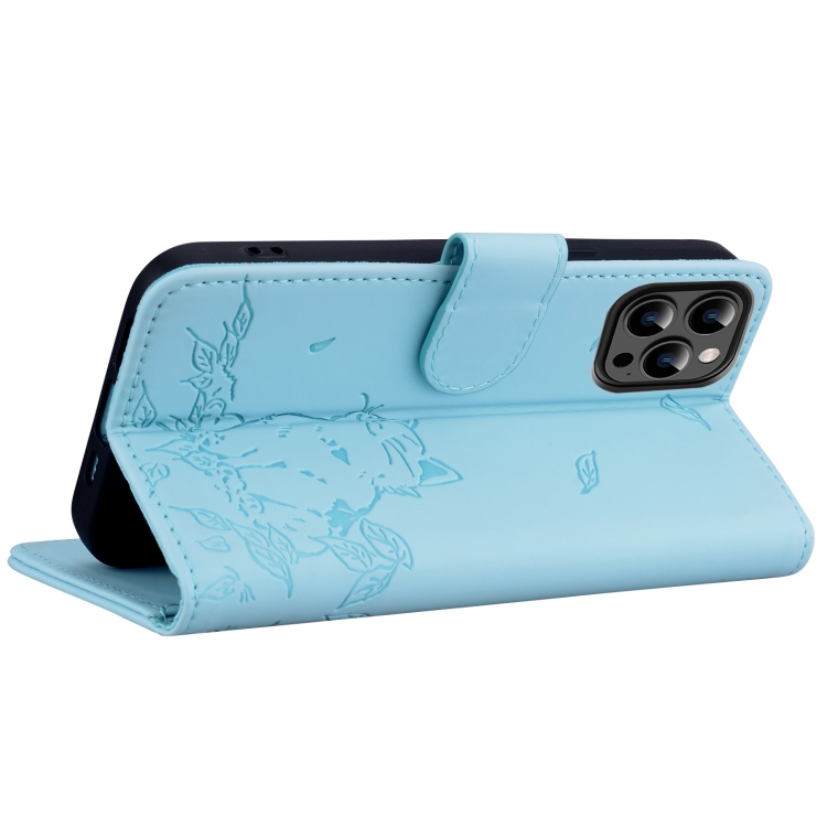 Funda de Piel para iPhone 16 Pro Max Estampado de Gato (Azul Cielo)